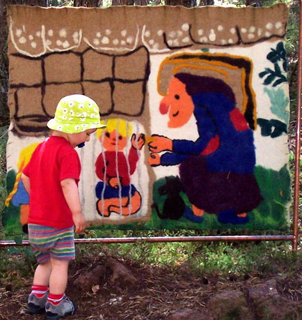 Uno dei sette arazzi che narrano la fiaba « Hänsel und Gretel ». Creati da bambini di scuole dell' Alto Adige con la guida di Josef Winkler nell' ambito del progetto scolastico « La pecora, tesoro nel forziere ». Foto Barbara Eichhorn